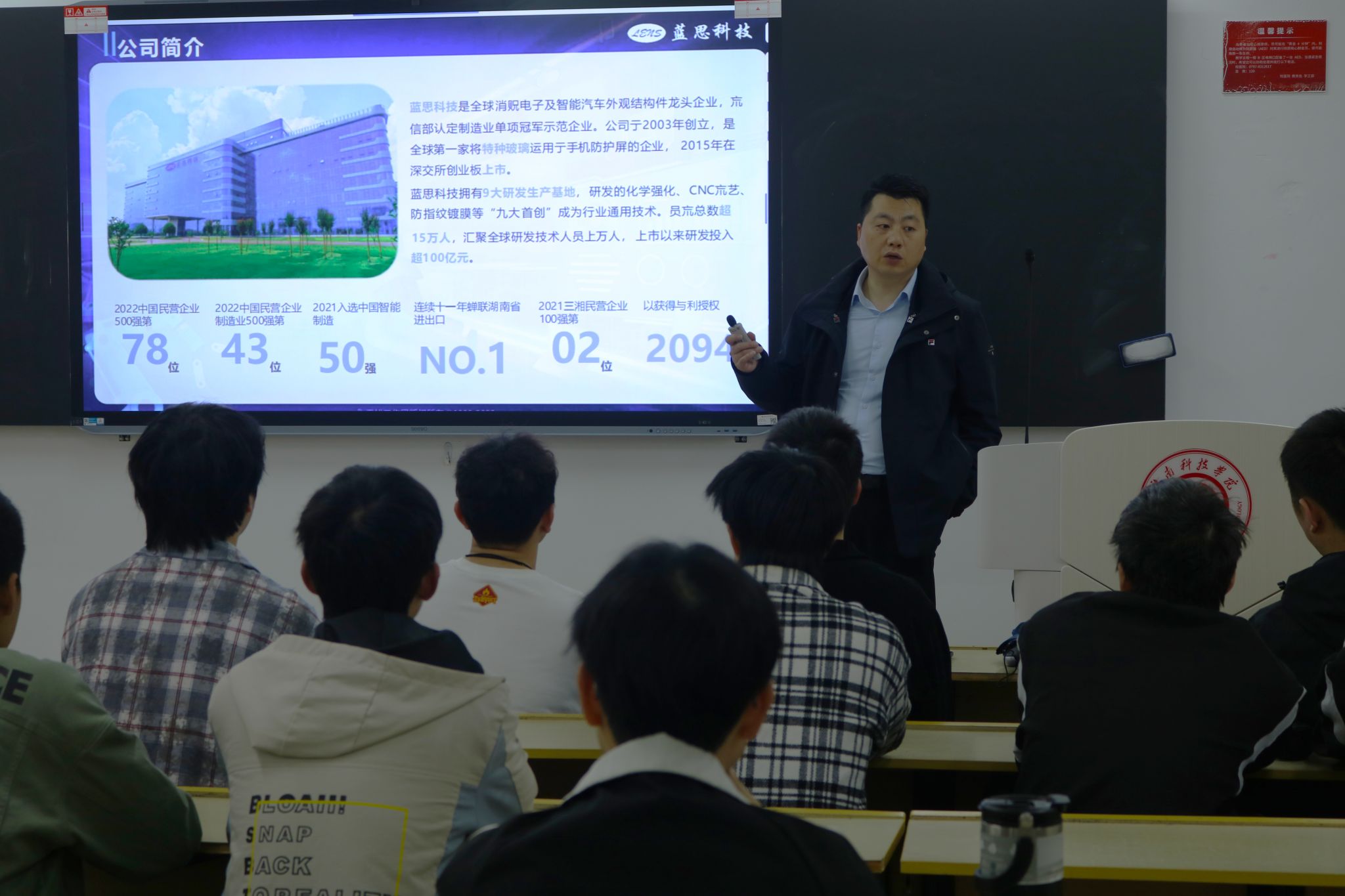 宣讲会上,蓝思科技的宣讲人朱先生详细介绍了公司的发展概况、企业文化、业务领域以及未来发展规划。公司于2003年创立,是全球第一家将特种玻璃运用于手机防护屏的企业,2015年在深交所创业板上市。作为智能终端一站式设计制造商,蓝思科技在行业内享有盛誉,其卓越的创新能力和广阔的市场前景为学生们提供了广阔的职业发展空间。