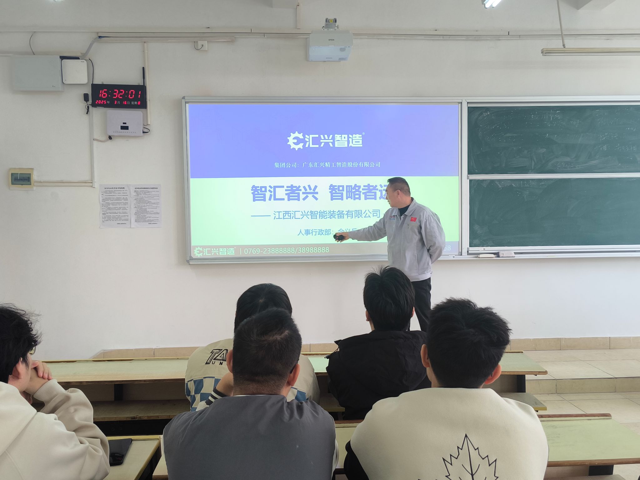 宣讲会上,江西汇兴智能装备有限公司的宣讲人金义兵先生详细介绍了公司的发展概况、企业文化、业务领域以及未来发展规划。广东汇兴精工智造股份有限公司,称汇兴智造。2000年始创于广东东莞,是一家集智能装备设计、研发、制造、营销为一体的国内高新技术。2016年,公司挂牌“新三板”,2017年,公司进入“新三板创新层”受尊敬的企业、建受尊敬的平台”的企业使命,践行“创于手、精于工、智于器、匠于心、品于行”的工匠精神。