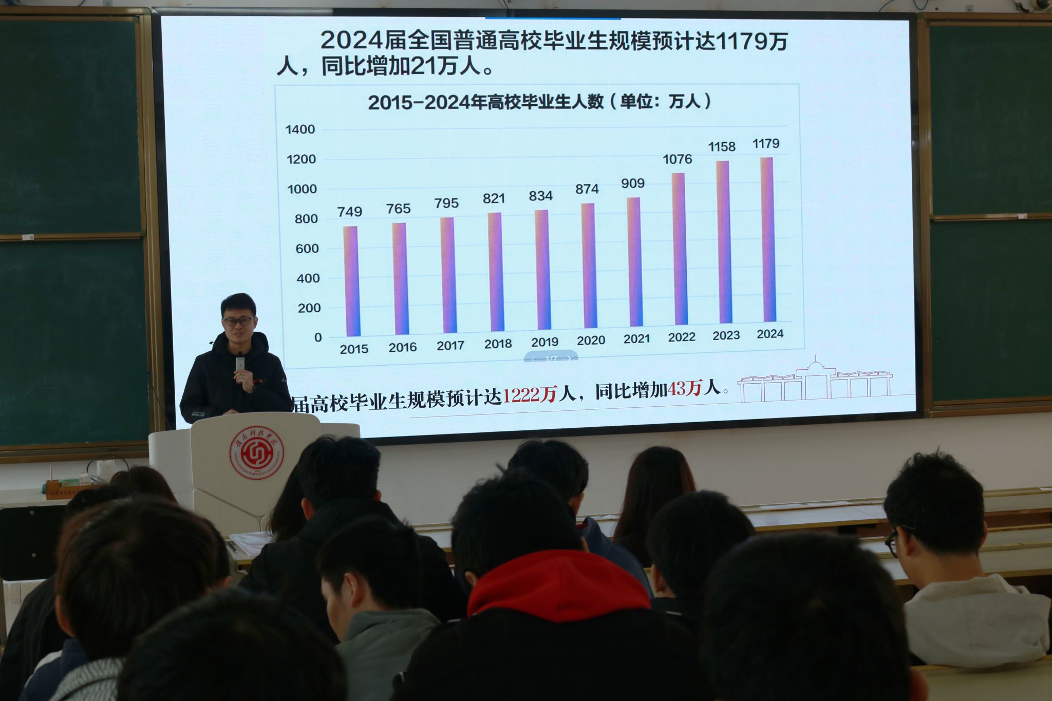 朱根松结合当前就业形势,围绕“机遇与挑战并存”展开深入解读。他指出,毕业生需主动适应经济发展新格局,树立“先就业、再择业”的就业观念,将个人职业理想与国家战略需求相结合。同时,朱根松表示征兵入伍与考研深造是拓展人生路径的重要方式,鼓励符合条件的学生积极响应国家号召,并提醒考研学子科学规划备考策略,实现个人成长与学校发展的同频共振。他现场结合学院近年来多名退役复学学生的成长案例,鼓励学子投身国防事业,在军营淬炼工匠精神。
