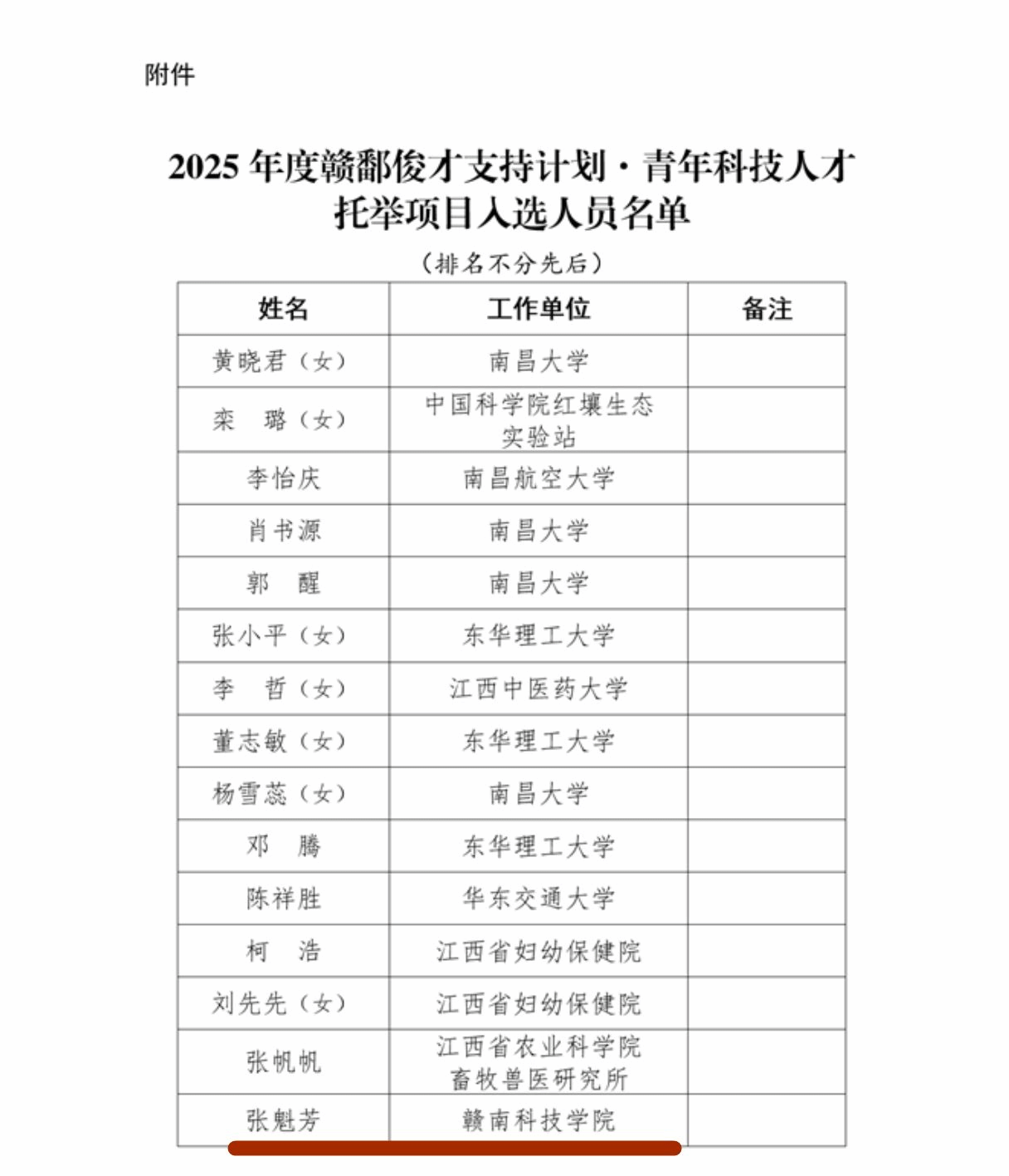 张魁芳博士成功入选江西省科学技术协会公布的2025年度赣鄱俊才支持计划·青年科技人才托举项目,成为全省15名入选者之一,标志着bat365在培养青年科技人才方面取得了又一重要突破。赣鄱俊才支持计划·青年科技人才托举项目是江西省为培养和支持青年科技人才而设立的重要计划。学校近年来高度重视人才引进,着力培养青年科技人才。