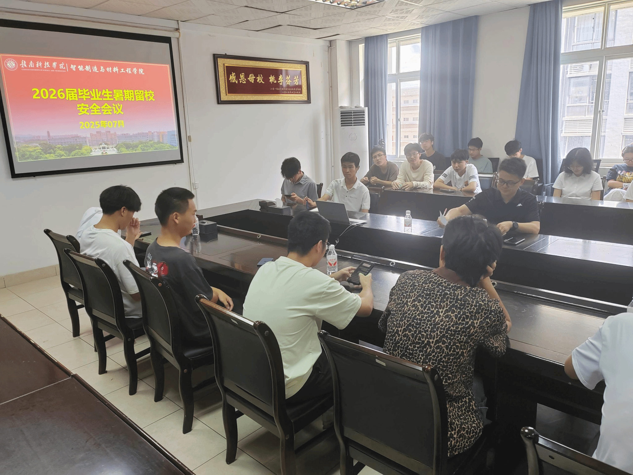 在安全会议中,肖志华围绕用电安全、人身财产安全、宿舍管理规范等方面进行了重点提醒。他强调,学生留校期间要严格遵守学校各项管理制度,不得私自外出过夜、留宿他人,不得违规使用大功率电器,注意防范诈骗行为,确保人身与财产安全。同时,他鼓励同学们充分利用暑期时间,积极投入考研复习与职业发展规划,不虚度暑期时光。