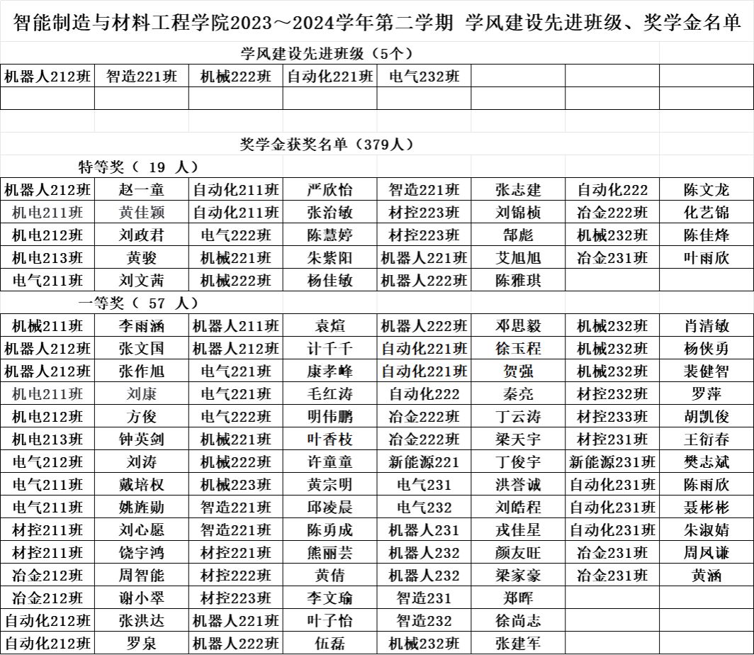 根据学校《关于做好2023-2024学年第二学期学生综合素质测评及学生综合奖学金评定工作的通知》文件要求,按照《bat365官方网站学生综合素质测评评定补充细则》有关规定,经学生本人申请、班级认定评议小组评议、学院认定评审领导小组审定,拟确定机器人212等5个班级获得学风建设先进班级称号,赵一童等379名学生获得综合奖学金。现予以公示,公示期为:2024年10月22日到10月24日,公示三天。如有异议,请在公示期内与学院反映。