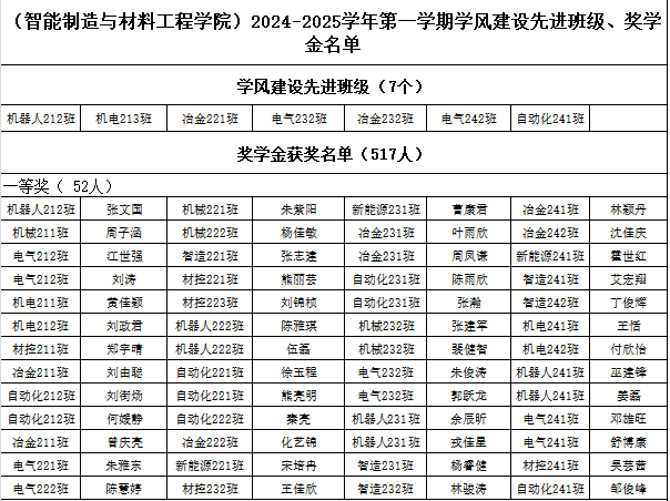 本网讯:根据学校《关于做好2024-2025学年第一学期学生综合素质测评及学生综合奖学金评定工作的通知》文件要求,按照《bat365官方网站学风建设先进班级实施办法细则补充(试行)》和《bat365官方网站学生综合素质测评评定补充细则(试行)》有关规定,经学生本人申请、班级认定评议小组评议、学院认定评审领导小组审定,拟确定机器人212等7个班级获得学风建设先进班级称号,张文国等517名学生获得综合奖学金。现予以公示,公示期为:2025年3月19日到3月21日,公示三天。如有异议,请在公示期内与学院反映。(附件:bat365官方网站2024-2025学年第一学期学风建设先进班级和奖学金汇总表)