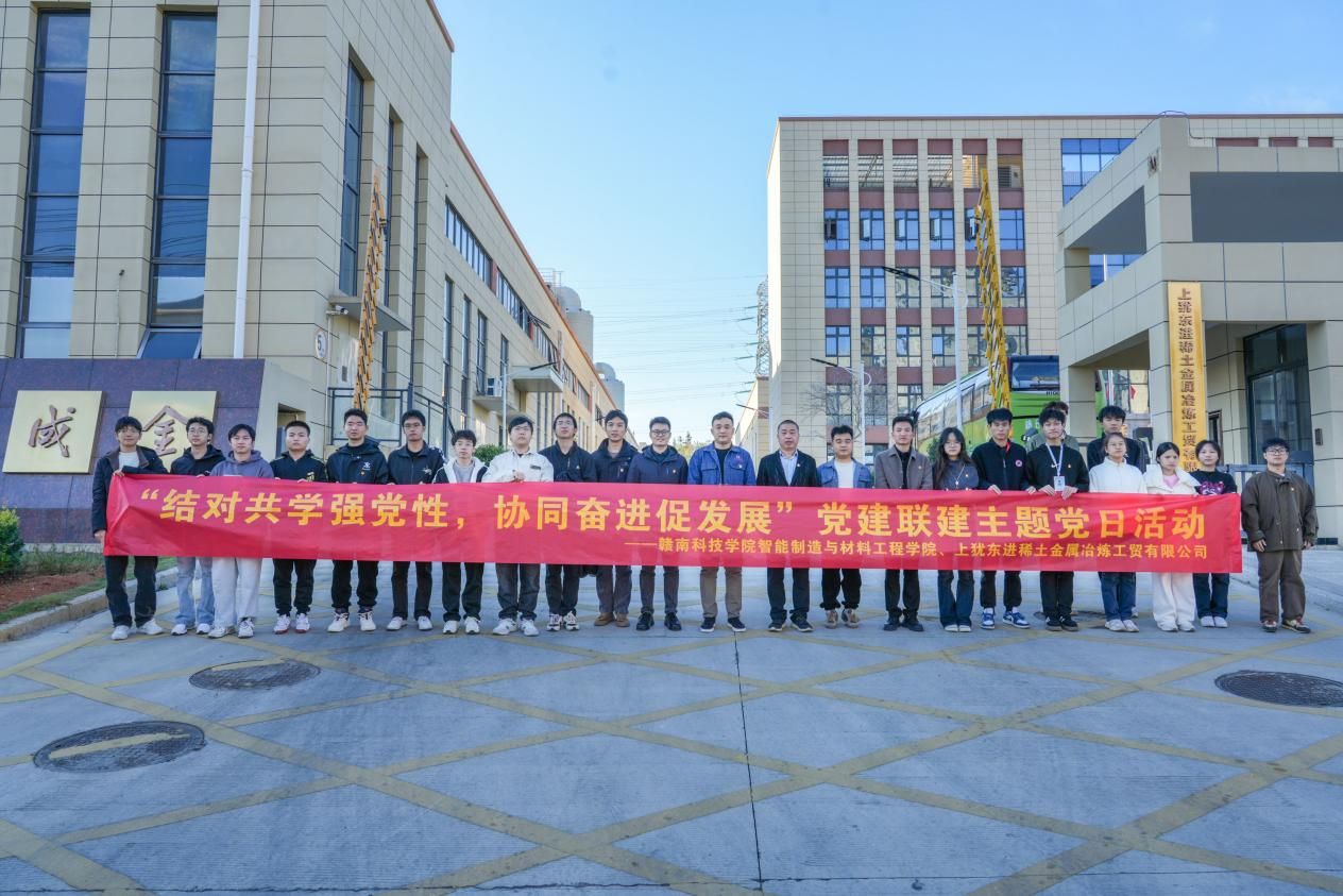 本网讯:11月20日下午,bat365官方网站bat365官方网站党委副书记朱根松等一行23人,赴上犹东进稀土金属冶炼工贸有限公司,联合开展以“学全会精神,谋事业发展——结对共学强党性,协同奋进促发展”为主题的党日活动。东进稀土金属冶炼工贸有限公司负责人罗林生等人参与了本次活动。双方通过共学、研讨、实地观摩等形式,推动党建与业务深度融合,探索校企合作新路径。