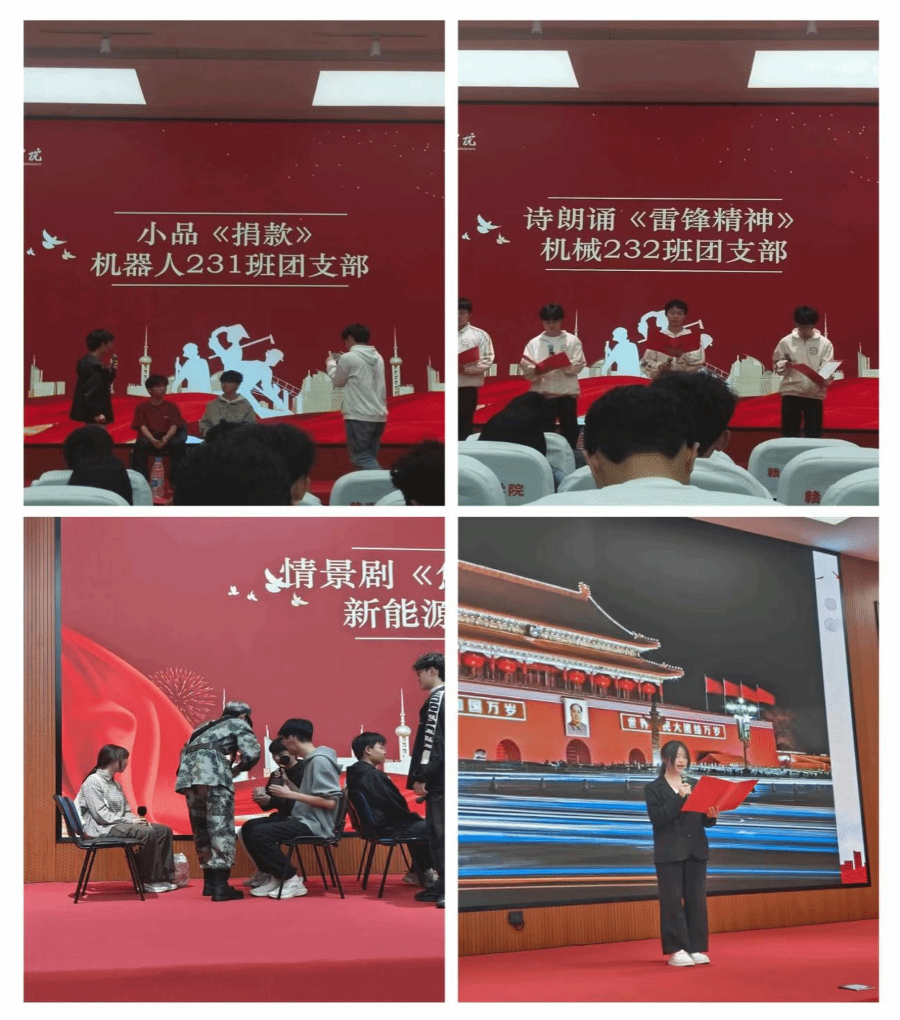 话剧《以雷锋之精神,实现中华民族之复兴》以生动形象的表演和真挚的情感向观众展现了灾难来临,新时代青年迎难而上,不断前行;朗诵《雷锋故事》,给我们分享雷锋的生平事迹,呼吁青年在新的时代赓续雷锋精神,传承雷锋精神;情景剧《您好,雷锋叔叔》用一幕幕平凡普通的历史场景,再现“雷锋出差一公里,好事做了一火车”;小品《捐款》以贴近大学生平常生活的表演,悄然揭示着雷锋精神的历久弥新。