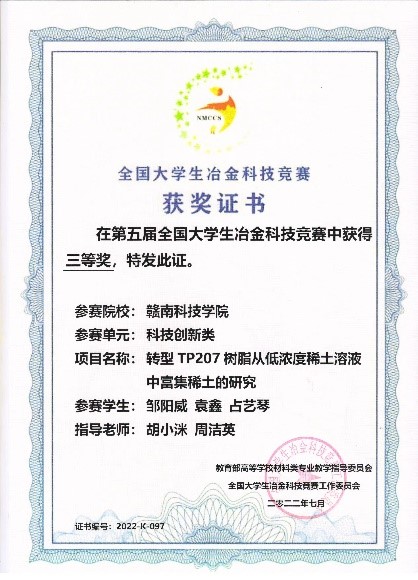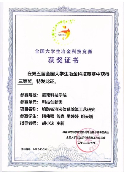 这是bat365第一次参加此项竞赛,通过选拔赛、半决赛及全国总决赛各项比赛,最终bat365荣获全国二等奖一项,全国三等奖两项,其中艺术设计202班徐海青、吴晓敏、周丽萍三名同学荣获第五届全国大学生冶金科技竞赛总决赛创意设计类二等奖,冶金192班邹阳威、袁鑫、占艺琴、陶伟强、曾鑫、吴婷婷、胡天增七名同学荣获第五届全国大学生冶金科技竞赛总决赛“科技创新类”三等奖。