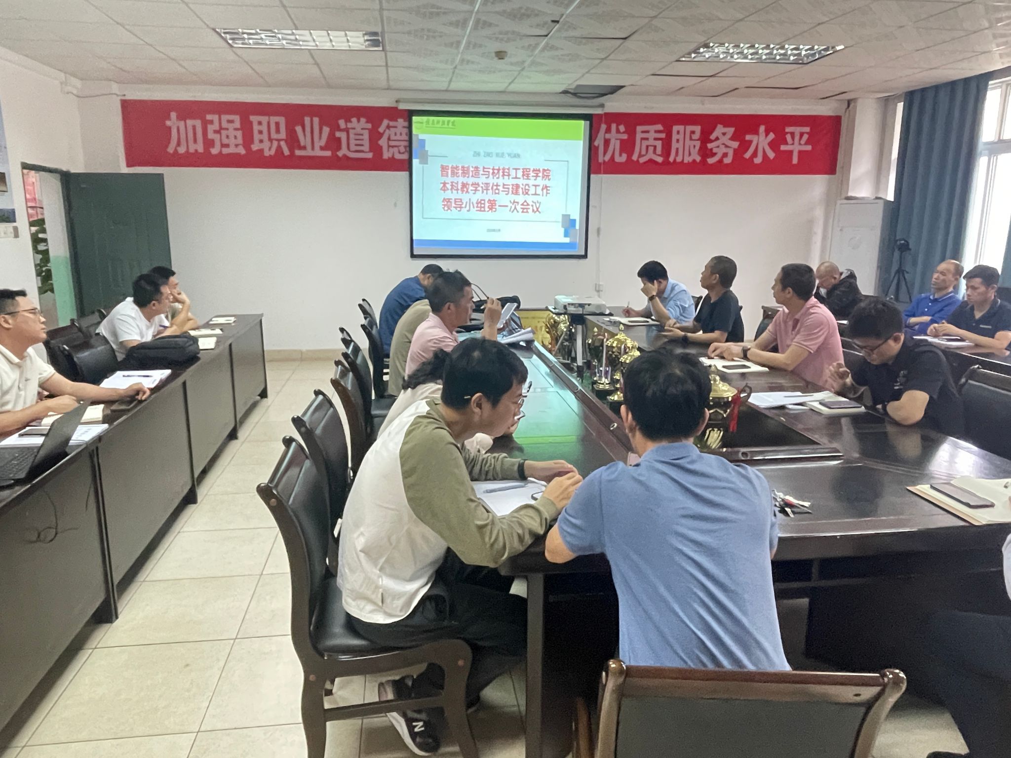 在本次会议中,我院制定《bat365官方网站本科教学工作合格评估实施方案》(初稿),依据实施方案成立了学院本科教学工作合格评估领导小组,并组建教学评估与建设办公室、教学质量组、学风建设组及宣传与督导组。