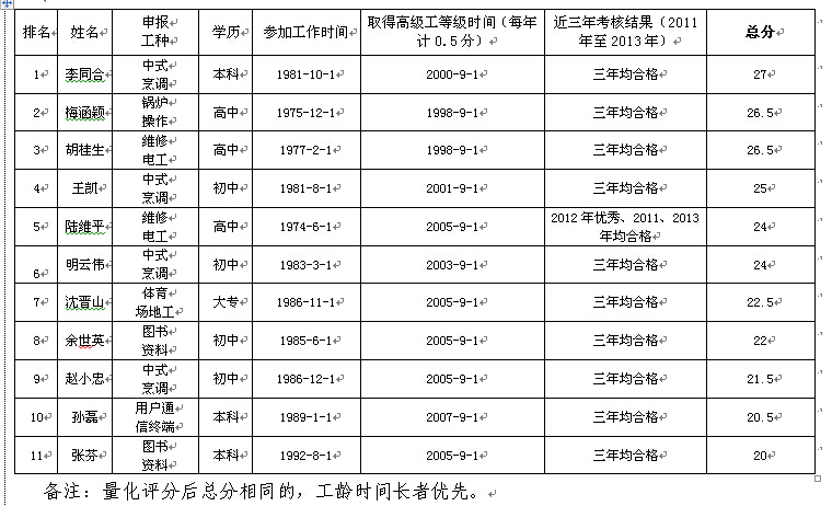 根据江西省人社厅《关于开展全省机关事业单位工勤人员岗位等级考核工作的通知》(赣人社发〔2014〕453号)和九江市人社局及学校有关文件精神,学校开展了工勤人员岗位等级考核申报工作。经九江市人社局核定,本次工勤人员岗位等级考核学校有2名技师职数,组织人事部按照《beat365官方网站岗位设置实施暂行方案》(九院字[2014]48号)中《beat365官方网站专业技术和工勤技能岗位竞聘量化评分细则》有关规定,组织了相关部门对申报技师人员进行了资格审查和量化评分。依据量化评分情况,学校将从高分到低分等额推荐申报,现将符合申报技师条件人员的量化评分结果公示如下: