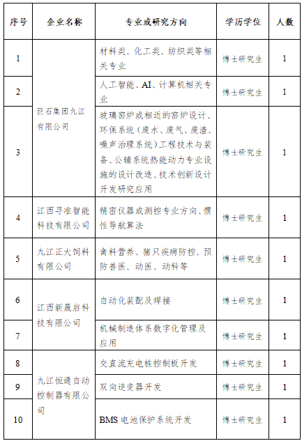 为进一步推动人才复用政策落地,经学校与九江经开区前期对接,现将相关企业博士需求信息发布如下,有意向地博士可通过“2+3”或“全脱产”模式服务企业,详情请咨询人事处。