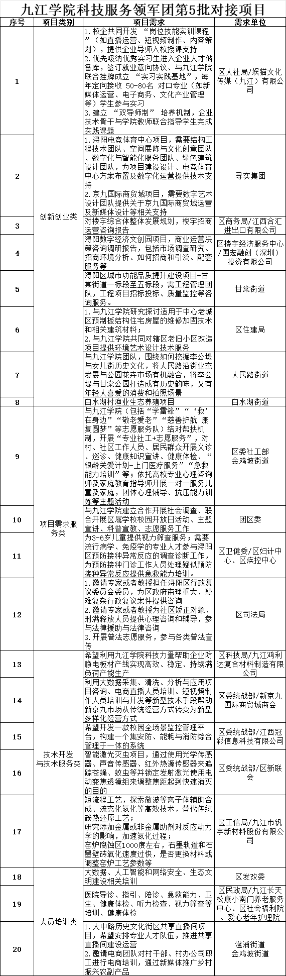 为贯彻落实《beat365官方网站服务九江经济社会发展三年行动计划(2024-2026)》(九院党字〔2024〕66号)文件要求,通过科技服务领军团对浔阳区经济社会发展相关需求进行征集,确定以下20项为第5批社会服务项目,现面向全校发布项目信息。