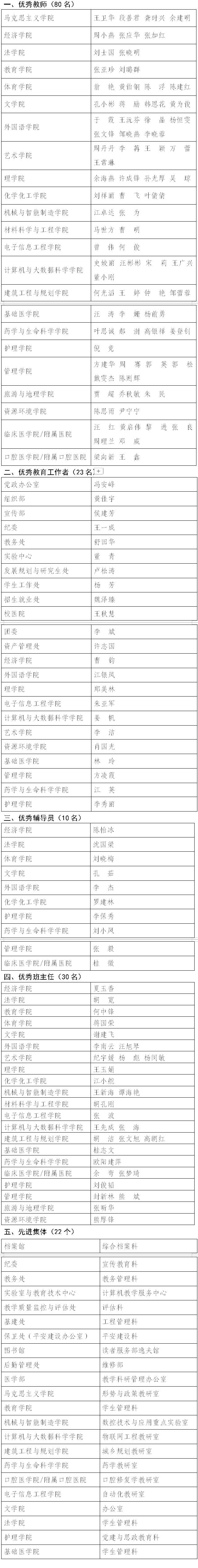 根据《关于做好2024-2025学年优秀教师、优秀教育工作者和先进集体评选工作的通知》(九院字〔2025〕54号)和《关于评选2024-2025学年优秀辅导员、优秀班主任的通知》(九院党学工字〔2025〕8号)文件要求,经各基层单位民主推荐、职能部门审核、学校研究,拟表彰80名优秀教师、23名优秀教育工作者、10名优秀辅导员、30名优秀班主任和22个先进集体。现予以公示。