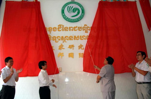 在大家的热烈欢呼和掌声中,文塔烈和谢运生共同拉开了红红的帷幕,孔子学院暹粒联邦国际学院正式揭牌成立。