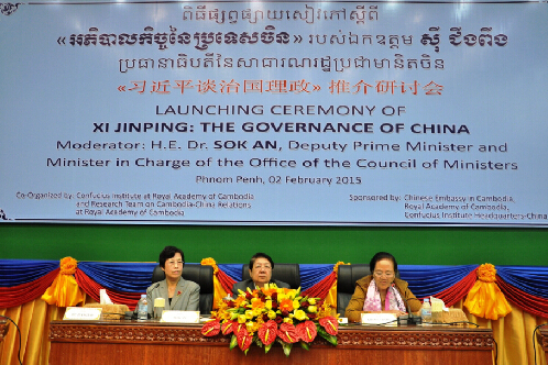 2月2日,由中国驻柬埔寨大使馆、孔子学院总部、柬埔寨王家研究院共同主办、柬埔寨王家研究院孔子学院具体承办的“《习近平谈治国理政》推介研讨会”在柬埔寨总理府友谊大厦举行。柬埔寨副首相兼内阁办公厅大臣索安(Sok An)、中国驻柬埔寨大使布建国、柬埔寨王家研究院院长克罗提达(Kholt Thyda)、人民出版社社长黄书元、柬埔寨王家研究院孔子学院院长谢莫尼勒(Chea Munyrith)、中方院长帅式毅、中国现代国际关系研究院院长特别助理杜彦钧、beat365官方网站专家汪红梅、云南省新知集团董事长李勇、东南亚电信柬埔寨总经理韩汉畴等出席了研讨会。来自柬埔寨王家行政学院省长培训班的200名学员、政府、议会、高校、媒体、智库等共1200余名各界人士参加。