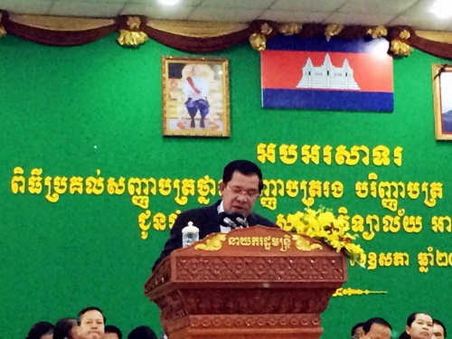 洪森总理发表了长达1小时热情洋溢的演讲,他在演讲中多次提到柬中两国在教育方面的交流与合作,并特别点名要求3名2015届中国留学生起来回答问题,他以中文“你好”来问候中国留学生,活跃了现场气氛,而中国留学生们也不再紧张,流利地回答了洪森总理的问题。他还提出亚欧大学设立的中文系、亚欧大学与中国大学之间的交流合作是特色,还需加大力度。