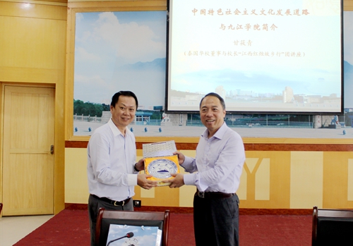 简短而热烈的欢迎会结束,校领导与泰中华文教育基金会会长魏青互赠纪念品并合影留念。而后,甘筱青校长作了题为“中国特色社会主义文化发展道路”讲座。从中华历史中分析中华文化发展道路,横向纵向的对比中华文化发展的利弊,最后肯定社会主义核心价值观的现实意义,总结如今的文化发展的三大战略任务:一、“以理服人”,提升国际话语力;二、坚持中西交融,开展文明对话;三、创新传播体系,重建社会信仰。讲座后,校长甘筱青也对九院做了简单的介绍,希望泰方校董能对位于庐山之麓、长江之滨、鄱阳湖之畔的九院留下美好的初印象。