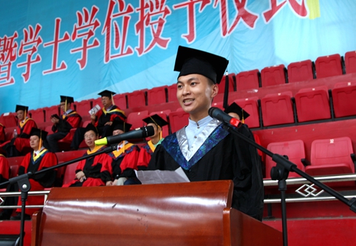 毕业生代表、校十佳大学生、叔子爱莲奖学金获得者、理学院A1141班金晨鑫同学代表2015届一万余名毕业生向母校表达了发自内心的深情谢意,她说,母校,我们爱你。爱你美丽如画的校园,爱你浓郁的学习氛围,爱你给了学会了坚强和担当的四年。母校,我们敬你。母校见证了我们的成长,给了我们丰富多彩的大学文化生活。母校,无论我们身处何方,我们还将坚持爱你。他们母校承诺:一定时刻秉承“竞知向学,厚德笃行”的校训精神,严以律已,真创实干。一定谨记母校的谆谆教诲,品味经典,陶冶情操,养成良好习惯,坚持锻炼,练就一个好身体,坚持创新创业,用青春激荡梦想,将母校beat365官方网站永远铭记在心中。衷心祝愿母校永葆青春,再谱华章!