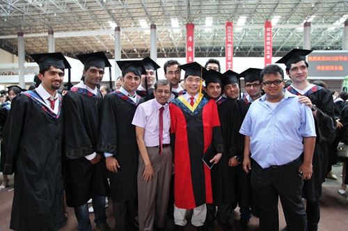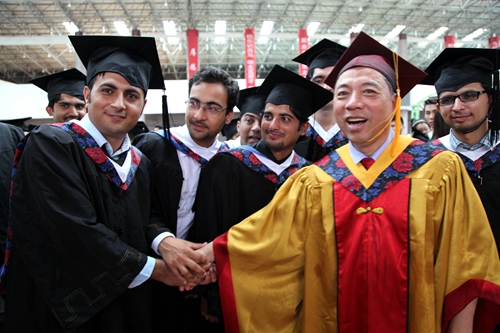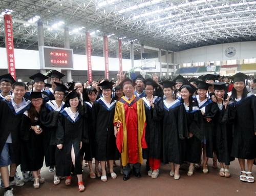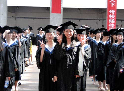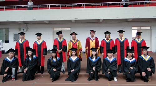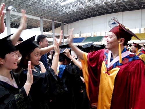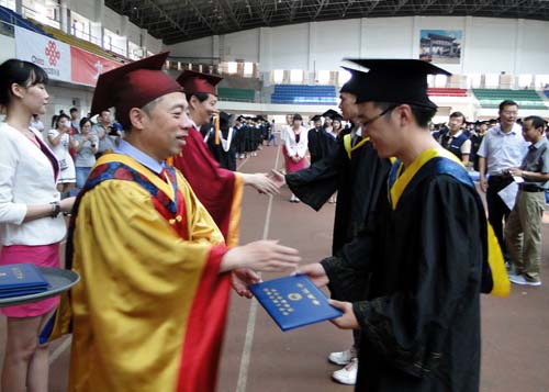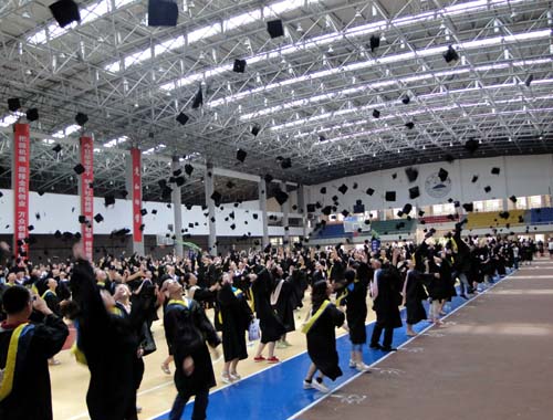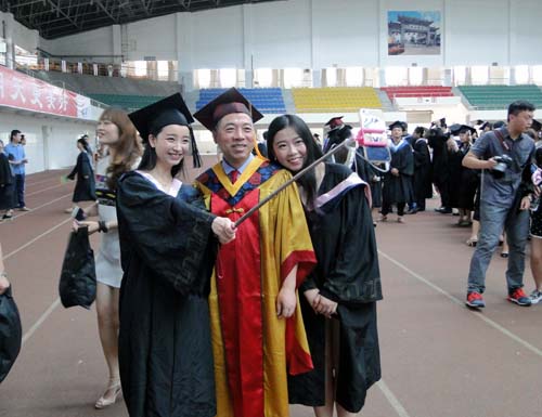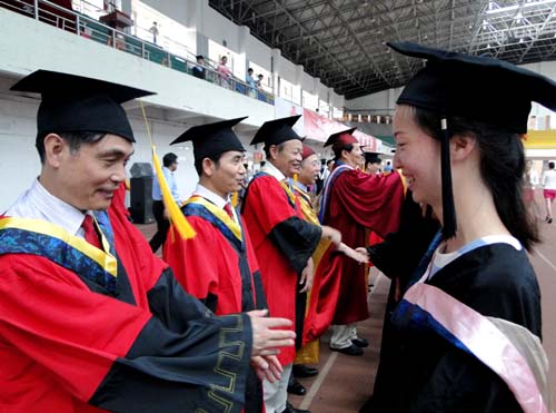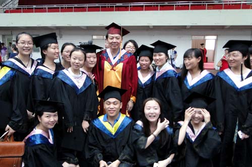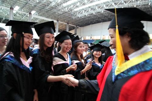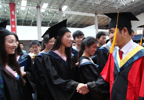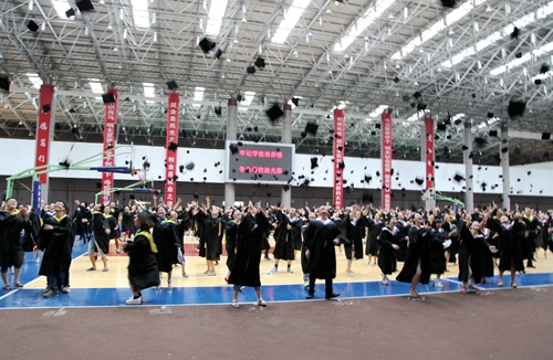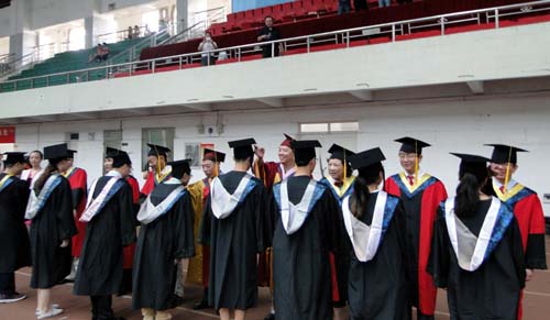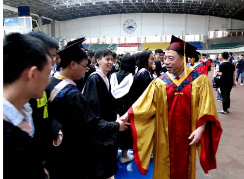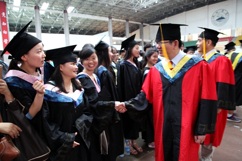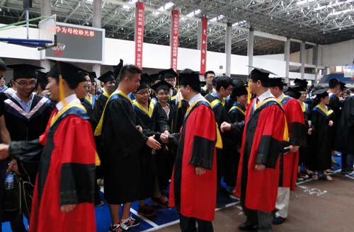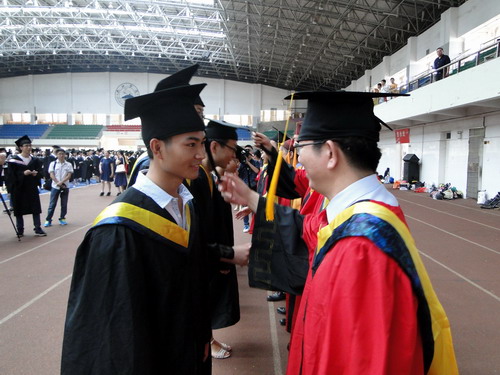 各二级学院领导和机关各部门负责人也分别走入毕业生队伍中,为全体毕业生扶正学位帽,拨转流苏。毕业生满怀激动,逐一快步趋前,向导师深深地鞠躬。整个会场气氛热烈、喜气洋洋,难忘的时刻凝聚在每个同学的笑脸上。