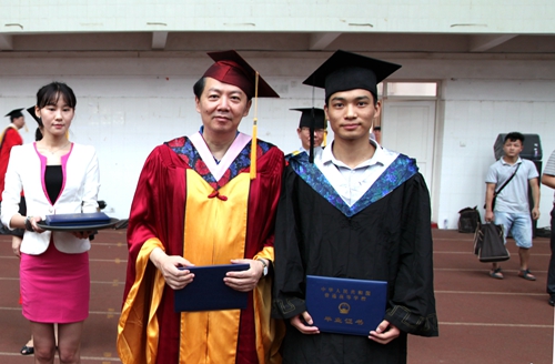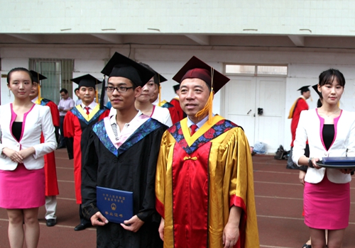 授予证书,师生情长。在热烈的掌声中,校党委书记郑翔博士和校长甘筱青博士给优秀毕业生代表颁发毕业证书。10名优秀毕业生代表依次走上前去接受郑书记和甘校长颁发的毕业证书,并逐个与郑书记和甘校长合影留念。