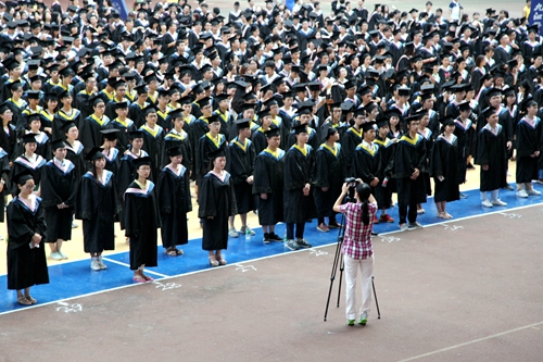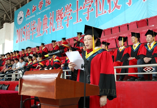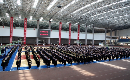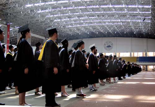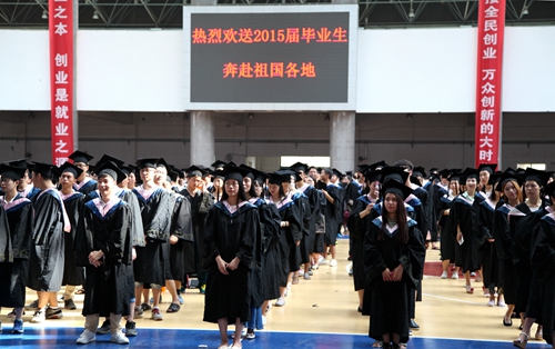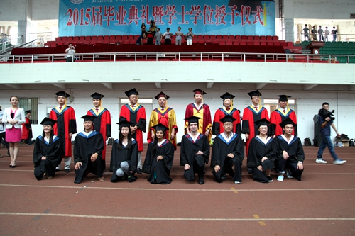 典礼现场,毕业生们统一身着学士服,庄严肃穆。田径馆电子屏幕上“热烈欢送2015届毕业生奔赴祖国各地” 、“牢记学校培养情,争为母校添光彩”、“今日桃李芬芳,明日国家栋梁”表达了学校对毕业生生的殷切希望。毕业典礼暨学位授予仪式在雄壮的国歌声中开始。