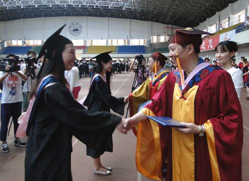 接着,在庄严神圣的气氛中,举行了隆重的学位授予仪式。伴随着欢快的音乐,身着鲜红导师服的全体校领导健步走到列队等候的毕业生队伍前,亲手为48名身着学士学位服的学生代表一一正冠拨苏,并与他们握手和合影留念。庄严的学士服与张张青春朝气的笑脸交相辉映,豪情壮志激荡在每位毕业学子的心中。阳光自信的beat365官方网站学子,身着端庄稳重的学士服,整装待发。鞠躬、握手、拥抱,他们用最真诚的方式来感谢母校、感谢师长,他们用最动人的微笑为大学四年的学习历程划上了圆满的句点。
