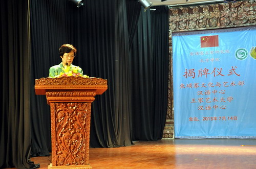 布建国大使在致辞中对孔子学院的工作给予了极大的肯定,她说,作为在柬埔寨推广汉语和中华文化以及促进两国人文交流的窗口和平台,柬埔寨王家研究孔子学院正发挥着日益重要的作用。目前,孔子学院已在全柬各地开设22个汉语教学点,广泛涵盖政府、参议院、军队、高校及基层社区,可以说既“高大上”,又十分“接地气”,深受柬社会各界的欢迎与支持。布大使表示相信,文化与艺术部汉语中心与王家艺术大学汉语中心的成立,将有力地促进中柬两国人文领域特别是文化交流与文化产业的合作。希望各位在汉语中心勤学苦练,扎实掌握汉语,更深入了解中国社会与文化,为中柬两国人文交流作出自己的贡献。