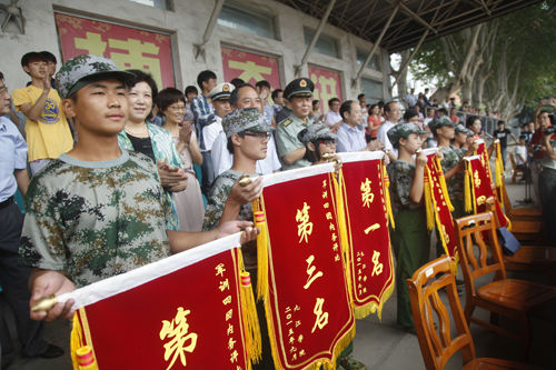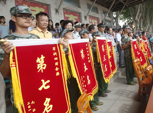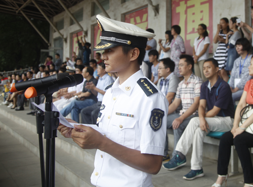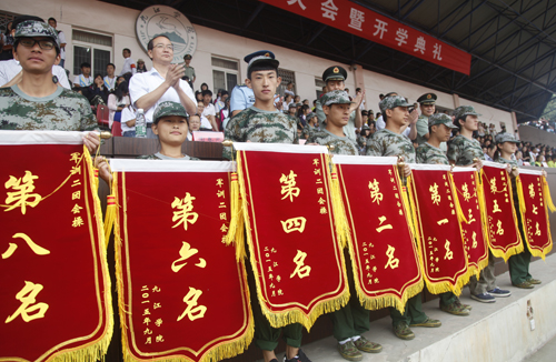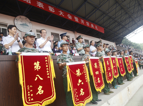 庐山区人民武装部副部长、军训旅旅长戴中付及海军后勤部队干事、军训旅第四团团长陈巍和学生处处长、军训旅政委刘平及浔东校区管理办副主任、军训旅第四团政委周学英分别宣布本次军训会操和内务评比结果。校领导和九江军分区领导为获奖班级颁发了锦旗。