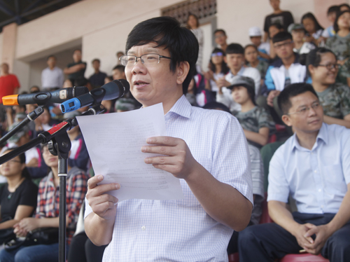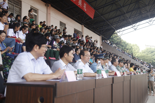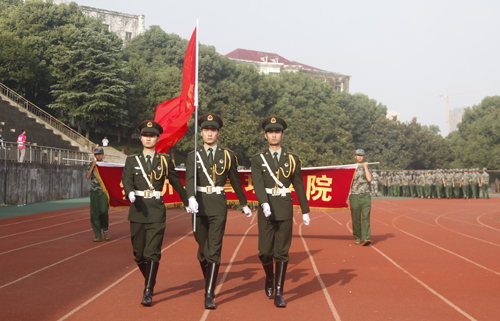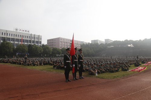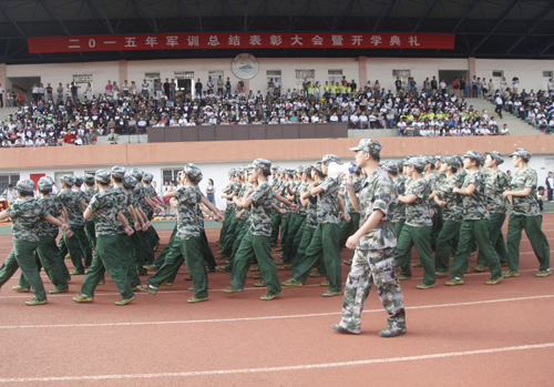 大会会场雄伟壮观,鲜艳的红旗在队前飘扬,雄壮的军歌在空中回荡。“军纪如铁,意志如钢,严格要求,勇争第一”、“激情飞扬,超越梦想、挑战极限、铸就辉煌”等大幅标语悬挂在田径运动场周围,94个排列整齐、精神抖擞的学生方队,迎着朝阳、激情满怀地等待着校领导和九江军分区首长的检阅。校领导甘筱青、吴桃娥、纪岗昌、王万山、陶春元、杨焱林,魏立平、杨耀防、九江军分区政委汪开华大校、九江军分区参谋长封志宏大校、空军场站参谋长张武中校及学校各二级学院党政负责人和有关部门负责人出席了大会。副校长王万山主持了2015级新生军训表彰大会。