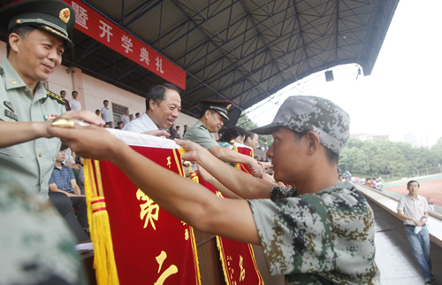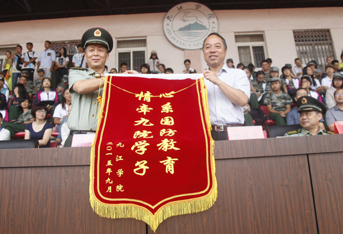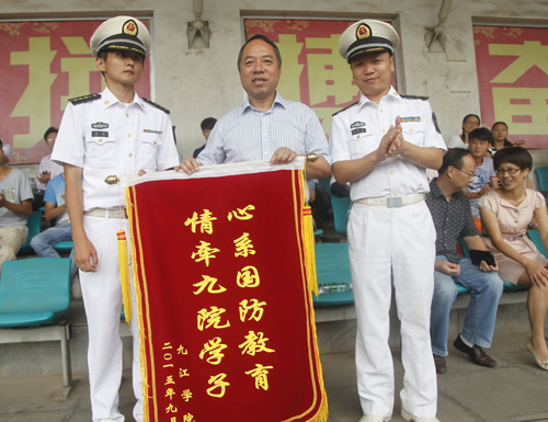 会上,甘筱青校长代表学校向九江军分区参谋长封志宏大校赠送了“心系国防教育,情系九院学子”的锦旗。