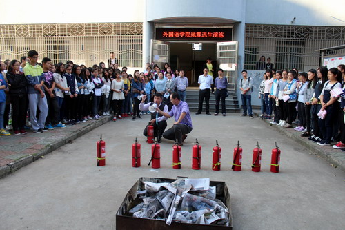 为进一步做好学生安全工作,切实提高同学们的安全防范意识和自救自护能力,10月14日下午4点,校保卫处联合庐山区消防中队、外国语学院在学生宿舍区举行了安防知识培训暨防火、防震等突发事件应急处置演练。保卫处处长张晓明、副处长吴新刚,庐山区消防中队曹指导员对此次演练过程进行了指导。外国语学院党委书记杨杰、副书记彭晓出席此次演练活动。学生科、团委负责人、全体辅导员、学生干部及2015级各班学生代表400余人参加了演练。