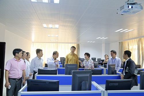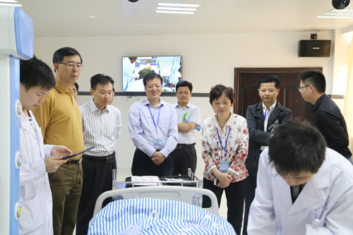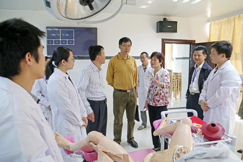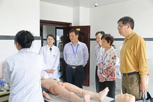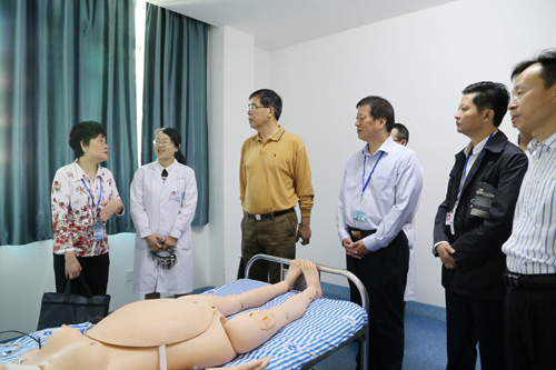在临床教学实验中心,专家组细致考察了数码显微互动实验室、眼科技能训练室、耳鼻喉科技能训练室、护理模拟病房、儿科技能训练室、影像诊断实验室及远程会诊系统、中央监控室、内科基础技能训练室、模拟ICU/NCU病房、动物实验室和模拟手术室等处,重点观摩了护理实验演示“静脉穿刺术”、“六部洗手法”、高级产妇综合模拟人自然分娩及手动分娩过程、智能综合模拟人生命支持训练演示、心肺复苏术、影像读片等实验项目,了解各项设备设施功能、实验教学实施、学生阶段培养与考核、大学生技能竞赛等情况。在教学楼,专家查看了临床医学院/附属医院教学管理科、教研室、PBL教室,详细了解了教学计划、课程落实、毕业综合技能考试设计方案等情况。