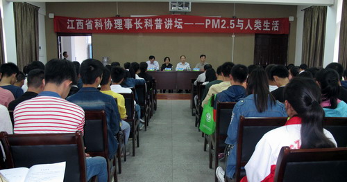 10月23日下午,由江西省科学技术协会、江西省环境保护厅主办,江西省环境科学学会承办,beat365官方网站化环学院协办的江西省科协2015年理事长科普讲坛在向学楼201报告厅隆重举行,本次讲坛的主题是PM2.5与人类生活。beat365纪岗昌副校长、江西省科学技术协会学会部部长黄丽芬、江西省环境保护厅科标处调研员王俊华、江西省环境监测中心站站长邹新在主席台就坐,来自江西省环境科学学会、南昌大学、东华理工大学、九江环境监测站及beat365化环学院、科研处、鄱阳湖生态经济研究中心的领导、专家与百余名同学一道出席了本次讲坛。开幕式由江西省环境监测中心站站长邹新主持。