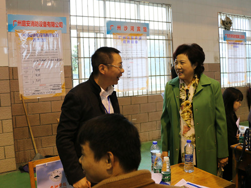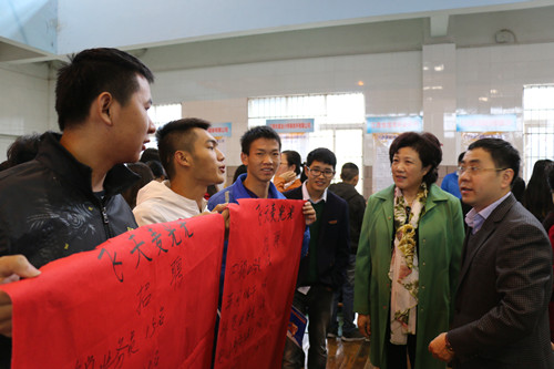 副校长吴桃娥来到招聘会现场,了解招聘会相关情况,走进每一家校友企业的展台,与来校招聘的校友深入交流,和前来应聘的应届毕业生亲切交谈,鼓励同学们大胆应聘,努力实现自身价值。