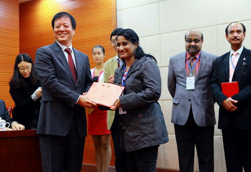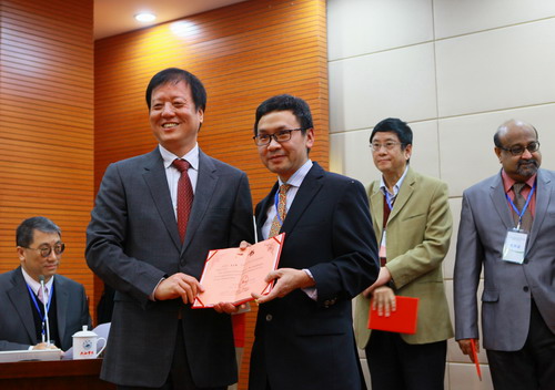 学术报告会结束后,举行了名誉教授受聘仪式,beat365临床医学院/附属医院院长张志平向各位专家颁发聘书。之后,郑翔、杨焱林、杨耀防等上台与受聘的各位专家握手表示祝贺并合影。郑翔等最后还同全体与会专家和嘉宾,以及师生代表在逸夫楼前合影留念。