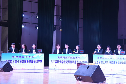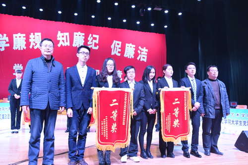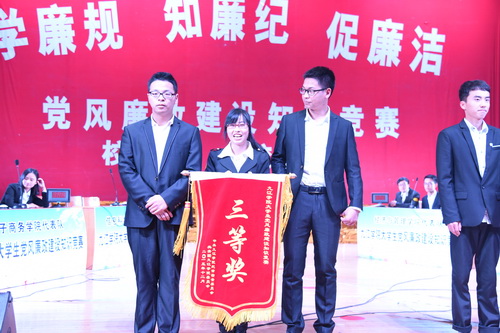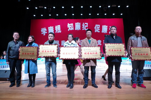 12月2日晚上7点整,主校区大礼堂灯火辉煌,宾朋满座。在悠扬的礼宾乐曲中,校纪委魏书记等一行在观礼席就座,参赛队伍进行了简短而精彩的亮相,主持人宣布,决赛正式开始,将时间推进到决赛时段。决赛环节进行了“个人必答”、“ 团体抢答”、“ 风险选答”三个环节的比赛,6支队伍在场上进行了激烈的角逐,并将比赛推入加时赛,引起观众阵阵喝彩,现场学生记者和观众纷纷拿出“长枪短炮”,闪光灯形成的光束此起彼伏,亮如白昼。经过反复较量,最终,旅游与国土资源学院脱颖而出,荣获一等奖;电子与商务学院、经济与管理学院荣获二等奖;护理学院、信息科学与技术学院和艺术学院荣获三等奖。比赛结束后,现场举行了隆重的颁奖仪式,校纪委、监察审计室和校学生工作处、团委相关领导魏立平、张晓明、刘平、闫来英、王英姿、宋艳萍、赵宇剑等为各获奖队伍颁奖,参加决赛的6个二级学院党委书记花金龙、王春生、黄伟、袁宜如、丁文林和丁蓉及6个二级学院的团委书记,校纪委、监察审计室全体人员和全校优秀学生干部、学生入党积极分子近千人参加决赛现场活动。