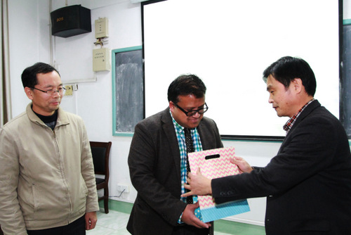最后,杨耀防副校长向外教Tanveer Raza颁发了荣誉证书,国际交流学院副院长何广代表国际交流处和国际交流学院所有同仁们送上给外教的临别纪念品,全体与会人员与外教Raza合影留念。