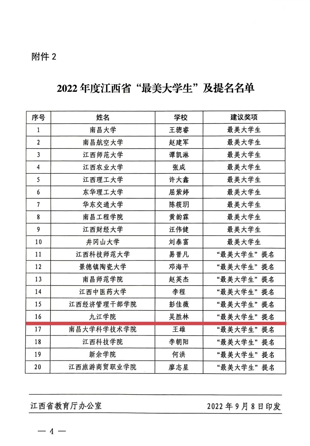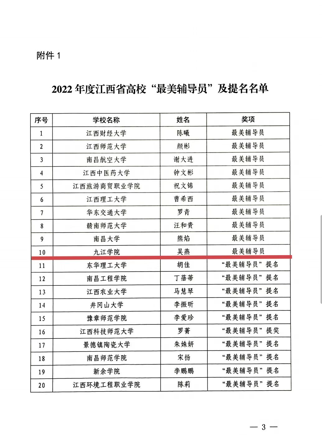 近日,中共江西省委宣传部、中共江西省委教育工委、江西省教育厅联合下发了《关于公布 2022 年度全省高校“最美辅导员”“最美大学生”推选活动结果的通知 》,beat365教育学院吴燕老师荣获2022年度高校“最美辅导员”称号,管理学院18级本科生吴胜林同学荣获2022年度 “最美大学生”提名奖。