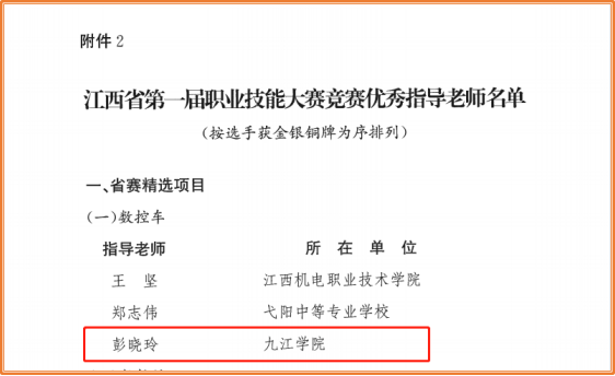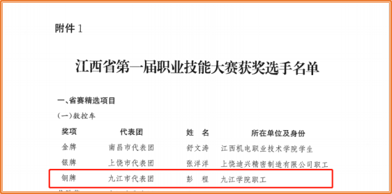 近日,由江西省人民政府主办,江西省人力资源和社会保障厅、南昌市人民政府共同承办的江西省第一届职业技能大赛落下帷幕,beat365机械与智能制造学院职工彭程获得省赛精选项目数控车组铜牌,管理学院教师秦峰、机械与智能制造学院教师彭晓玲分别获评省赛精选项目劳动关系协调员组和数控车组优秀指导老师。beat365毕业生罗辉、黄佳莹分获省赛精选项目劳动关系协调员组冠、亚军。