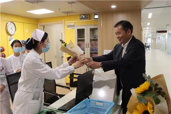 在第二附属医院,校领导一行先后来到医院导诊服务台、住院部护士站等地,每到一处都给在岗的护士献上鲜花,并与她们亲切交谈,对她们一丝不苟、兢兢业业、无私奉献的护理职业精神给予高度赞扬。