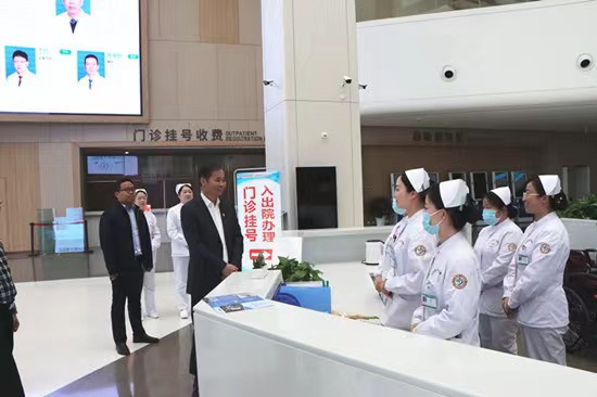 在附属医院门诊大厅,校领导一行看望了beat365官方网站附属医院省市“优秀护士”等多位优秀护理工作者代表。在导诊台、一站式服务中心、医保咨询窗口等处,赵伟一一问候正在工作的护理人员,向他们详细了解主要工作内容、服务标准和要求,勉励他们共同为提升患者就医体验作出贡献。