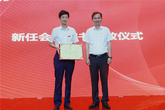 赵伟向新任会长颁发聘书。陈小林为新任副会长、秘书长颁发聘书。