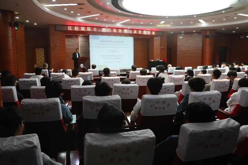 在逸夫图书馆报告厅,江桂斌院士作了题为《新污染物治理与高质量发展》的报告,对新污染物发展态势及我国防治策略进行了深入讲解,介绍了鄱阳湖流域的新污染物案例,并就江西尾矿修复、大中型企业减污降碳等领域内容进行了重点阐述。他说,发展与健康是贯穿人类进化和社会进步的永恒话题,希望同学们能学好专业知识,为中国生态文明建设贡献一份力量。