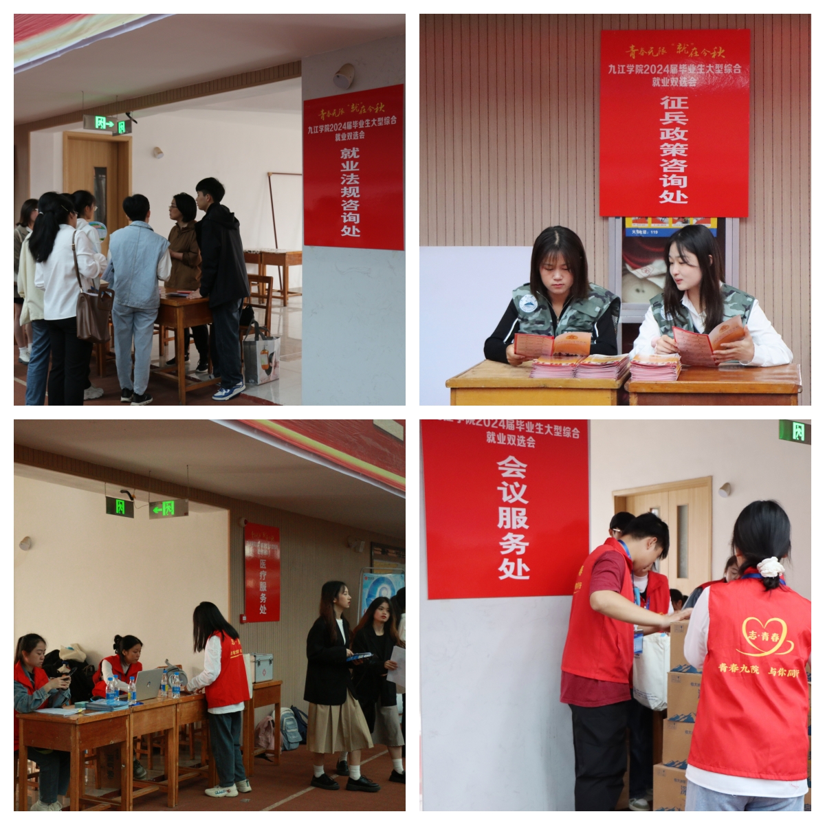 会议现场还设置了就业法规咨询处,邀请九江市人力资源和社会保障局参与,为学生带来就业政策、人才政策、法律咨询等服务。另外设置了征兵政策咨询处、医疗服务处、会议服务处,由学校武装部、校医院、招生与就业处负责有关工作。