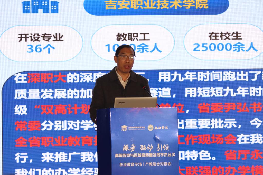 曾志珍作了题为《高职院校产教融合的实践与思考——以吉安职业技术学院为例》的报告,以吉安职业技术学院的实际做法为例,梳理吉安职业技术学院在产教融合中的具体做法,并总结出把握产教融合的方向性、适应性、差异性、协同性的特色发展道路。