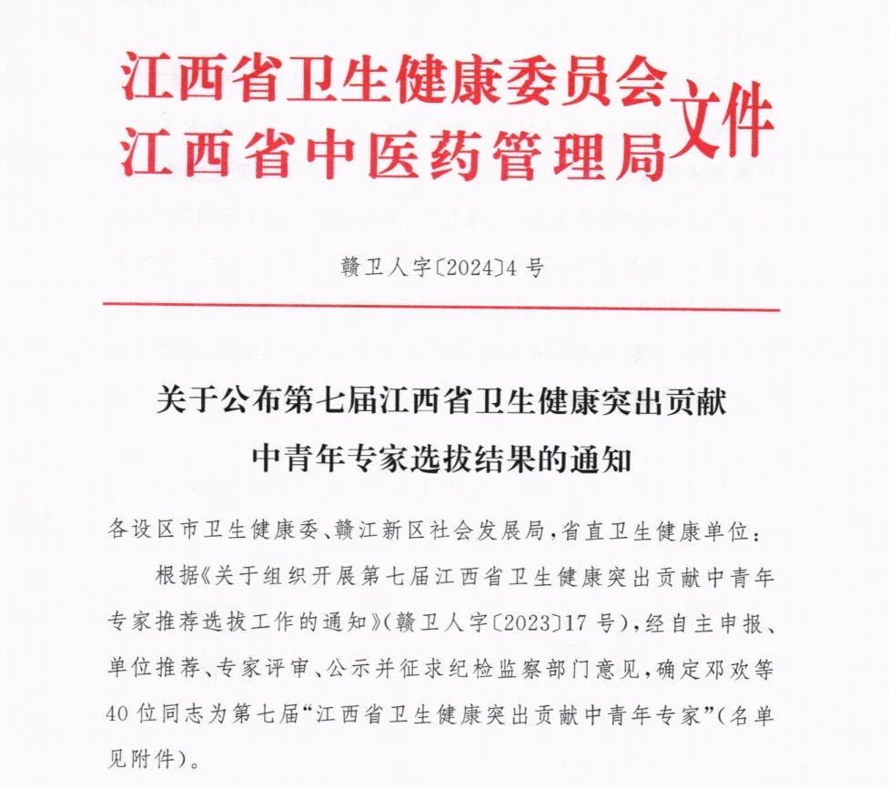 近日,江西省卫生健康委员会公布了第七届江西省卫生健康突出贡献中青年专家人选名单,来自全省卫生健康系统的40位中青年专家入选,其中beat365官方网站附属医院党委书记殷小平博士成功入选。