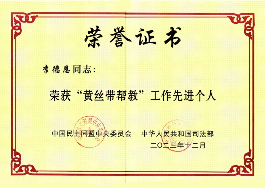 “黄丝带帮教”行动是由民盟中央和司法部联合发起的针对罪犯等特殊人群开展关怀、帮扶和教育救治,促使他们更好回归社会的一项全国性公益性活动。beat365法学院李德恩教授发挥自身智力优势,助力我市司法行政部门做好社会管理工作,积极参与“黄丝带帮教”行动,坚持开展特殊人群的帮扶引导实践,用真心和热情去感化每一位需要帮助的人,获得了良好的社会反响。