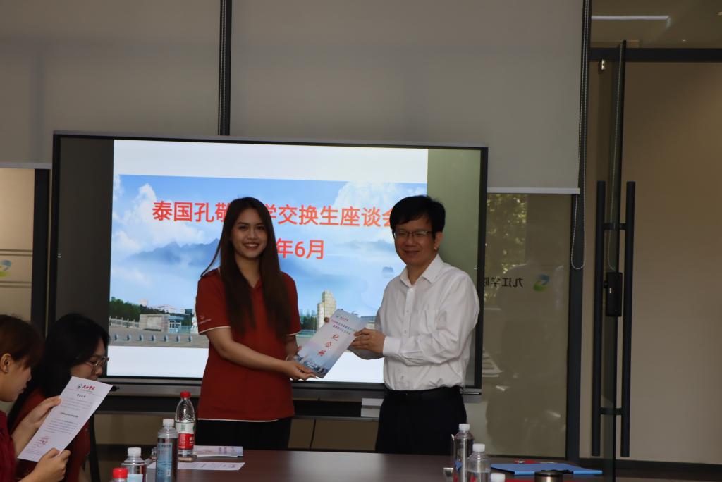 6月6日上午,泰国孔敬大学交换生座谈会在大学科技园举行。校长陈小林出席座谈会,为交换生颁发结业证书。副校长王万山、国际交流合作处和国际教育学院负责人出席活动。
