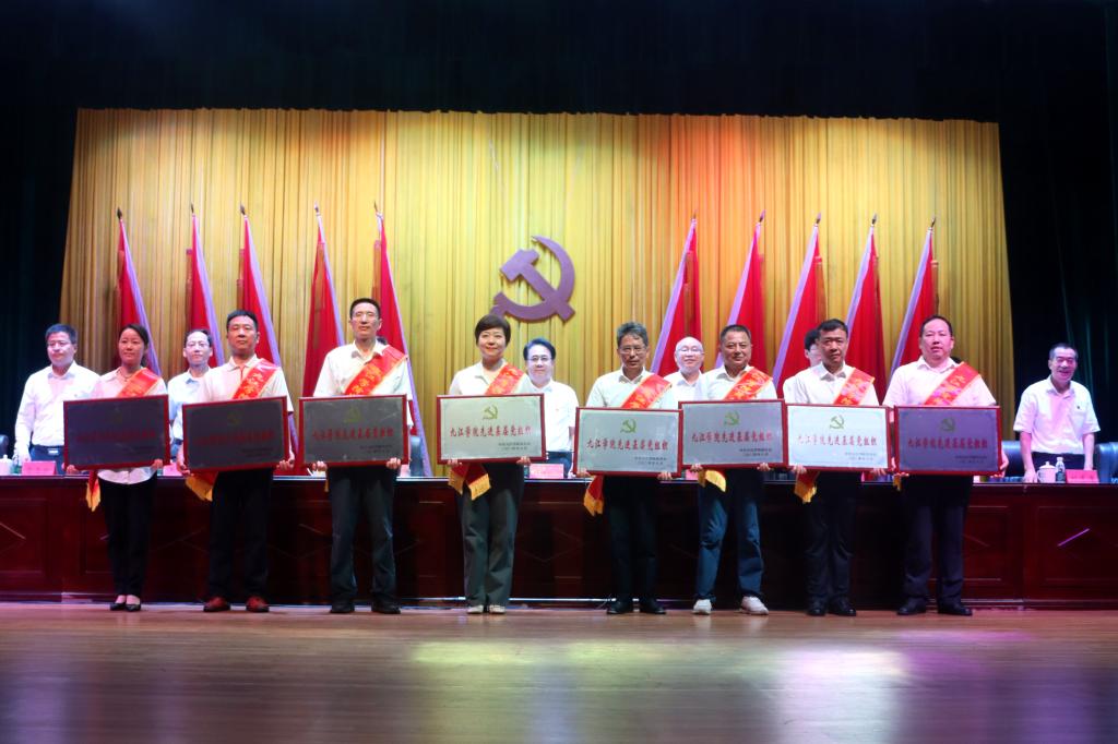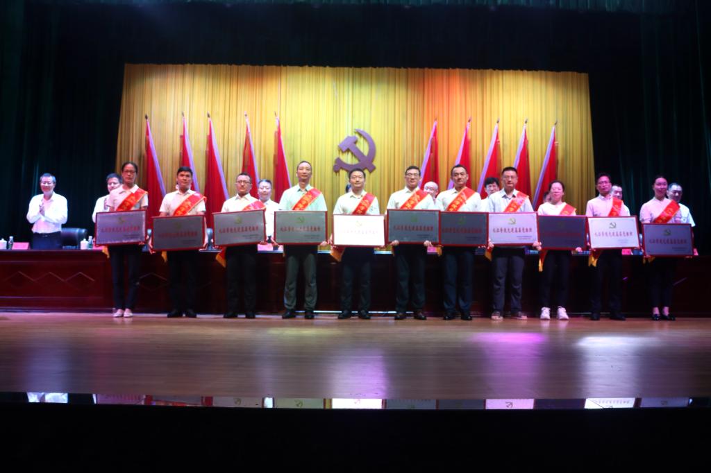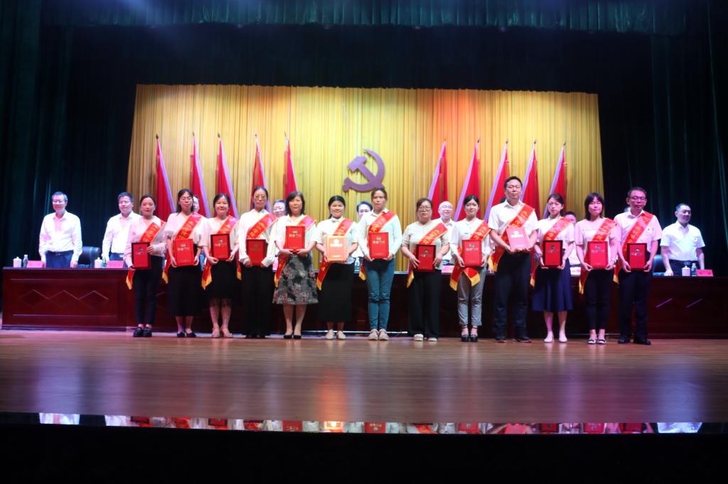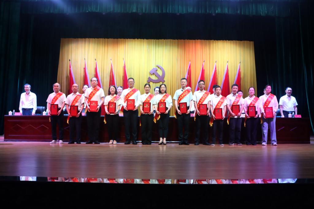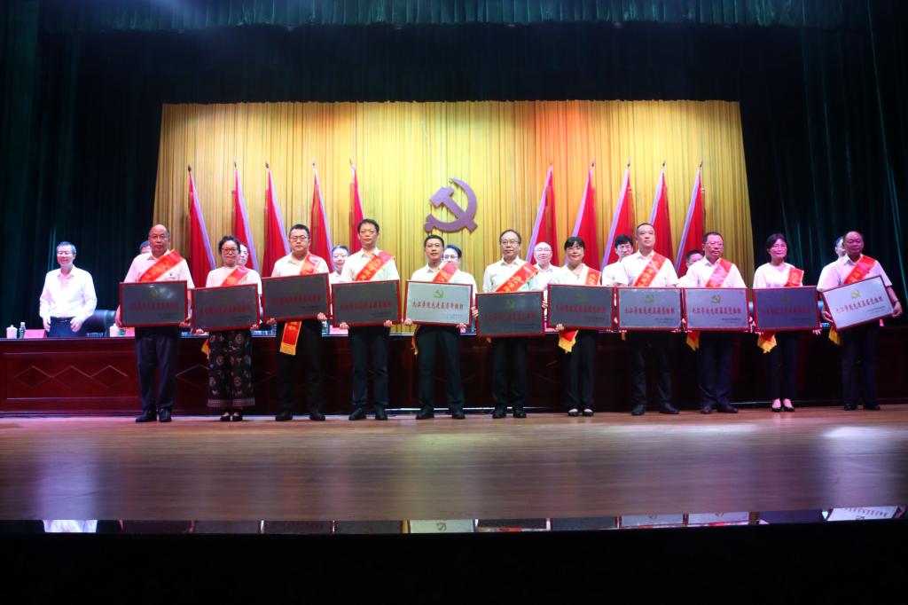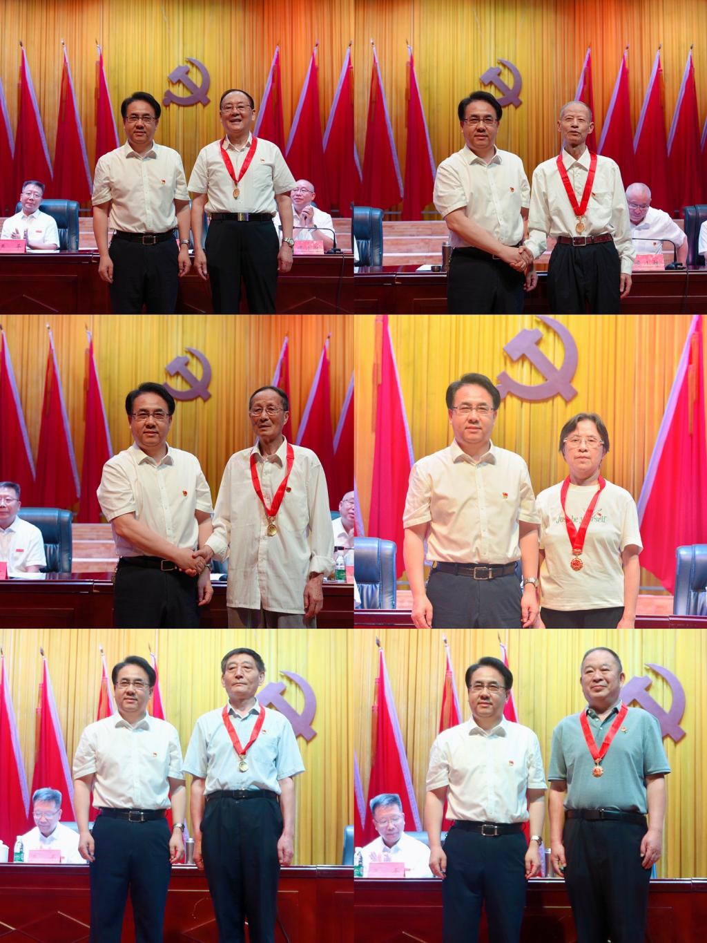 大会向“光荣在党50年”离退休党员代表颁发了奖章,对一年来在学校高质量发展征程中表现突出的125名优秀共产党员、30位优秀党务工作者、30个先进基层党组织进行了表彰。校党委书记李明斌和“光荣在党50年”老同志代表一一握手问好,亲自为他们佩戴奖章,并合影留念。校领导为相关先进个人和集体颁发证书、奖牌。台上台下强烈共鸣,会场内响起热烈掌声,激发党员以奋斗姿态勇毅前行的信念与决心。