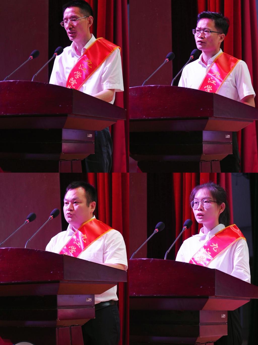 先进基层党组织代表、化学化工学院党委书记花金龙,优秀共产党员代表、药学与生命科学院教师孙启彪,优秀党务工作者代表、马克思主义学院教师谢伏华和优秀学生党员代表建工学院A2051班胡雅萍先后作了交流发言。三位教工党员表示,将在学校党委的坚强领导下,不忘教育初心,牢记育人使命,为把学校建设成为特色鲜明高水平应用型大学而努力奋斗。胡雅萍表示,将把荣誉转化为前进的动力、转化为工作的能量、转化为服务人民的热情,积极投入到工作中,为学校争光,为党旗增辉。