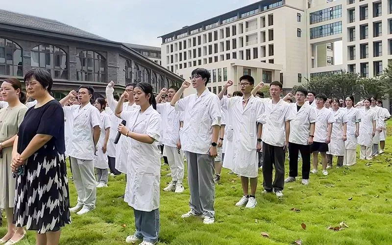 仪式上,学生代表向雕塑献花,并宣读医学誓词。