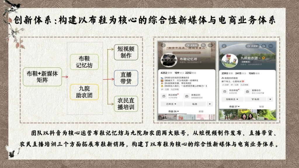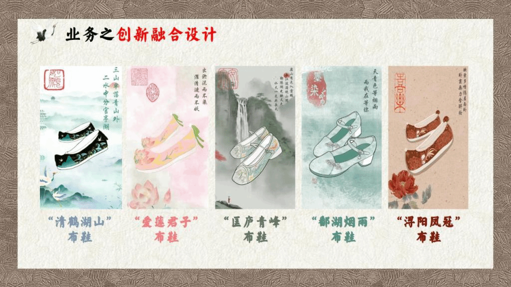 beat365代表队把消费者定位为深受注重悦己消费、民族认同感高的85后至00后,将布鞋与他们所喜爱的智能科技、国潮设计相结合,设计了“百重山”,一个集原创设计、直播培训、科技引流、新媒体营销、农民就业全覆盖的新型农业产业链逐步形成。为解决布鞋款式单一的难题,团队依托江西大江大湖、名山名人的特点,融入庐山,鄱阳湖,爱莲说等元素,设计出“浔阳凤冠”“匡庐青峰”“鄱湖烟雨”“爱莲君子”“青鹤湖山”等多款布鞋。同时,团队创新设计出“百重山智慧商城”“AR试鞋小程序”等吸引国潮爱好者的软件,利用智能科技实现了精准营销。